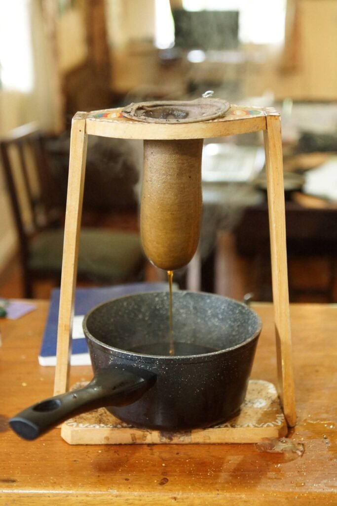 First thing is making coffee. I put my pot of water on the stove and turn the stove on. Then I take out my chorreador and rinse off the cloth bag called a bolsita , rinse ot off . I place the bolista in the Chorreador.