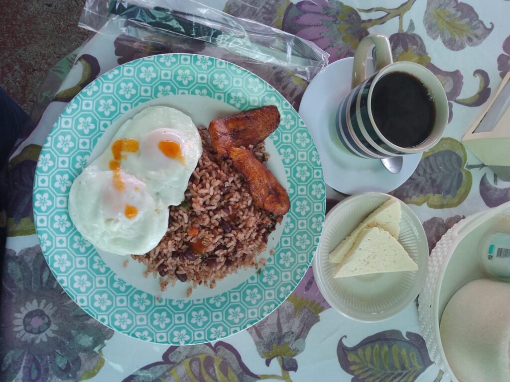 Typical Costa Rica breakfast. Gallo pinto, rice and beans, fried eggs, paltinos fried, and they gave me some fresh chesse. Total cost $8.00US