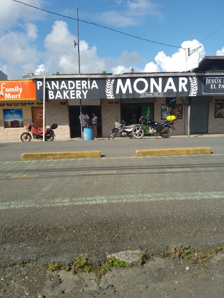 Right across the street from the bakery is Monka resturant. You might be able to get a bacon and egg breakfast here with fried potatoes . They do have great breakfast sandwhiches, and the bread they use is perfect . Also they have a small ice cream station, their milk shakes are wonderful. The day I took this photo it was trash day in Puerto Jimenez